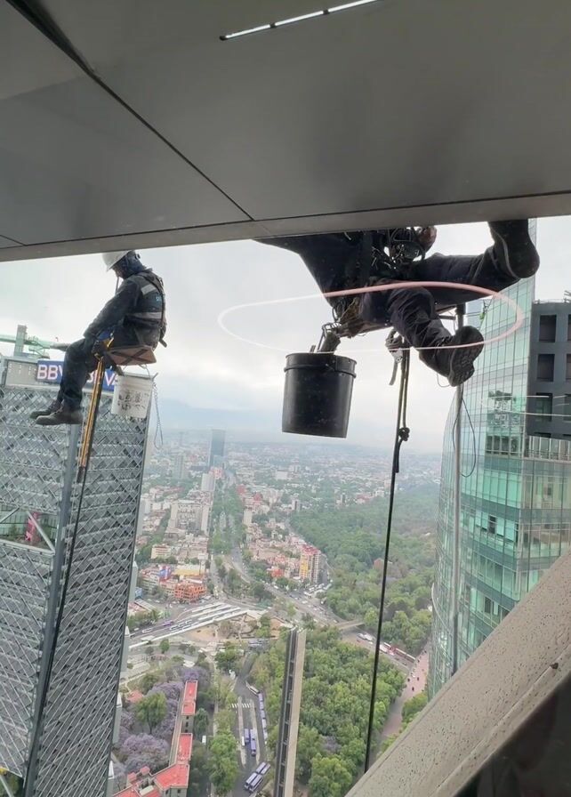 - "Two window washers suspended by ropes are working on the exterior of a tall building" by FM-pvUaz2, licensed under CC BY 4.0