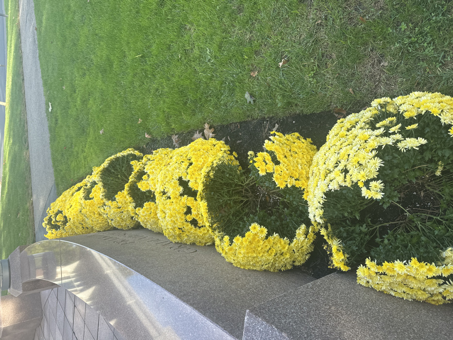 The image displays a ground-level view of a landscaped area in Wellesley, United States. A curved, light gray granite wall or base is positioned on the left, exhibiting faint, etched letters "GRAM..." on its vertical face. The top surface of this structure is composed of light-colored, square-patterned stonework. Adjacent to the granite, a serpentine arrangement of approximately seven mounded chrysanthemum plants extends along its curve. These plants are densely covered in bright yellow blooms, with visible green foliage beneath. A narrow strip of dark soil or mulch borders the plants on their right. Beyond this border, a well-maintained, vibrant green lawn occupies the remainder of the right side of the frame. A few scattered brown leaves are visible on the mulch and the edge of the lawn. The scene is illuminated by natural daylight, casting shadows on the granite and within the plant arrangements. No individuals, actions, or direct interactions are depicted.
