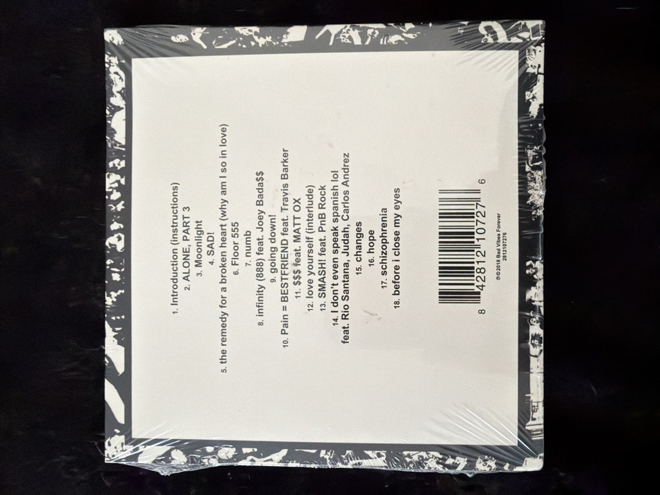 A rectangular music album package, sealed in transparent plastic shrink wrap, is centrally positioned on a dark, flat, and uniformly colored surface. The visible side of the package is the back cover, which features a prominent white central panel. This panel is bordered by a black-and-white graphic design depicting abstract or silhouetted human figures. The white central panel contains a black text list of 18 numbered tracks. The first track is "1. Introduction (instructions)" and the last is "18. before i close my eyes". Specific tracks indicate featured artists, including "10. Pain = BESTFRIEND feat. Travis Barker", "11. $$$ feat. MATT OX", "13. SMASH! feat. PnB Rock", "14. I don't even speak spanish lol feat. Rio Santana, Judah, Carlos Andrez", and "8. infinity (888) feat. Joey Bada$$". Below the tracklist, a black UPC barcode is displayed with the numbers "8 42812 10727 6". Underneath the barcode, copyright information reads "©️2018 Bad Vibes Forever" followed by the numerical string "2812107276". The plastic shrink wrap exhibits minor creases and reflections, particularly around the edges and over the tracklist area. The surrounding environment is uniformly dark, providing no additional contextual information or objects. The image provides no information regarding its geographical location within Bansko, Bulgaria.