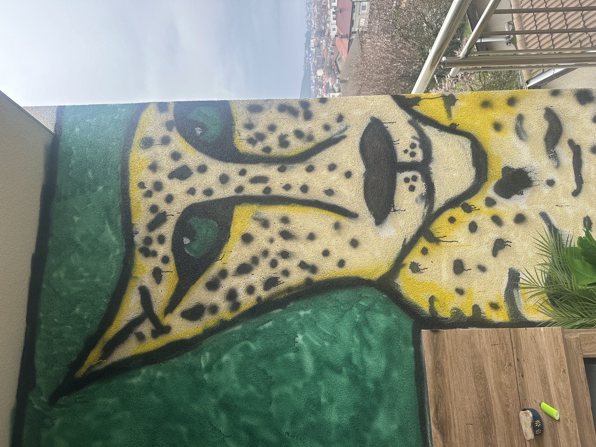 A close-up, medium shot captures a graffiti-style mural depicting the face of a jaguar, painted on a rough, textured wall. The jaguar's face is stylized with yellow, tan, green, and black colors, with prominent black spots scattered across its face. The background behind the face is primarily green. In the lower right corner, a section of a wooden structure is visible, on which a green and black object rests. Beyond the wall, in the background, a glimpse of a cityscape under a cloudy sky can be seen. Based on visual cues such as building styles and vegetation, this mural is likely located in Varna, Bulgaria. The scene appears to be outdoors, possibly on a balcony or terrace, evidenced by the presence of a metal railing in the upper right corner of the frame.