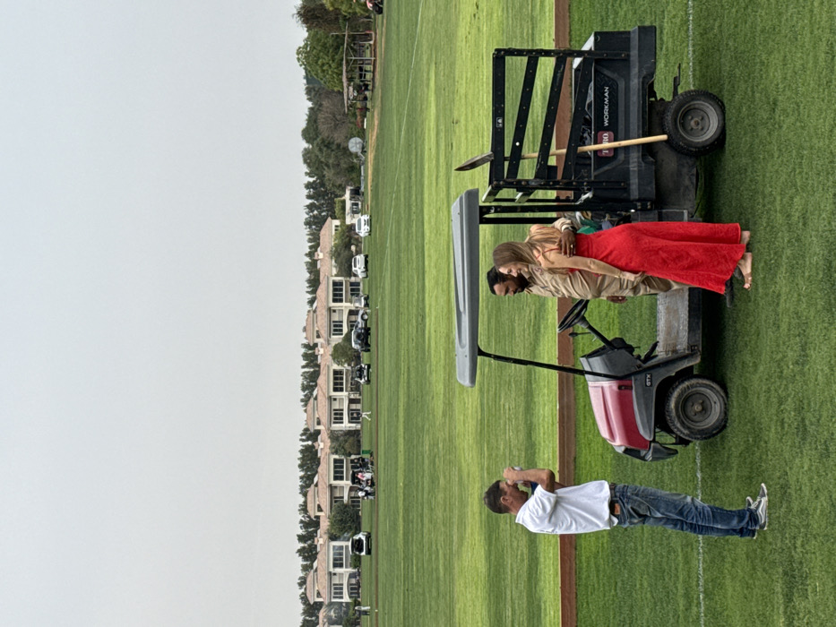 An outdoor scene captured under an overcast sky depicts three individuals on a manicured green field, likely a polo ground, within what appears to be a large recreational or private estate. In the immediate foreground, a man in a white short-sleeved shirt and blue jeans, wearing Vans sneakers, stands facing right, holding a silver-colored camera to his eyes, appearing to take a photograph. To his right, a red and gray utility vehicle, identified by "GTX" on its side, is positioned on the grass. A man in a tan jumpsuit with a dark beard stands next to the driver's side of the utility vehicle, his left arm around a woman in a long red dress. The woman, barefoot with long light brown hair, is smiling and facing slightly towards the left. The utility vehicle's rear bed, marked "TORO WORKMAN," contains two shovels. In the mid-ground, a reddish-brown dirt track separates the immediate grass from a vast expanse of green field. In the background, a row of large, multi-story, light-colored residential villas with reddish-brown tiled roofs is visible, fronted by a line of various parked SUVs and cars. Clustered near some of these vehicles are several indistinct figures and a green shaded structure. A thick line of trees runs behind the villas and extends to the right side of the frame. One individual is discernible walking on the distant green field. The architectural style of the villas and the extensive polo field suggest a location such as the Dubai Polo & Equestrian Club or Al Habtoor Polo Resort and Club in Dubai, United Arab Emirates.