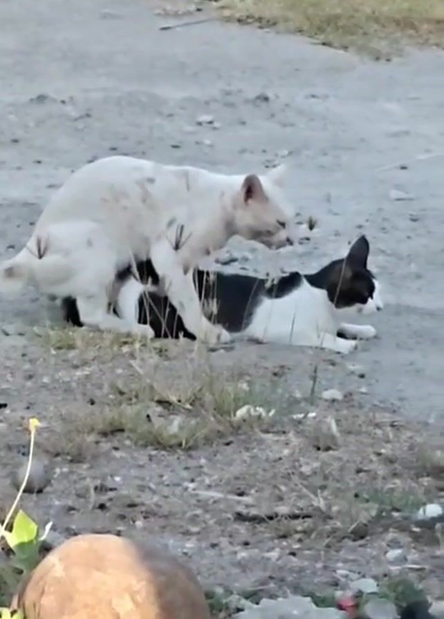 two cats mating. A white cat is on top of a black and white cat, which is lying on the ground. The ground is dirt and gravel with some sparse grass and trash. A large rock is in the foreground.