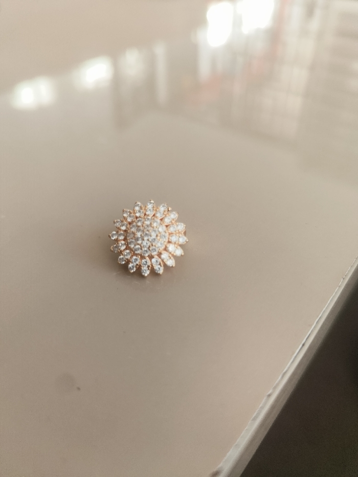 A small, round, rose-gold colored earring rests on a glossy, light brown surface. The earring features a dense cluster of small, clear stones in the center, surrounded by radiating, slightly elongated clear stones arranged in a floral or sunburst pattern. The surface reflects light, creating blurred highlights and a sleek, modern appearance.
