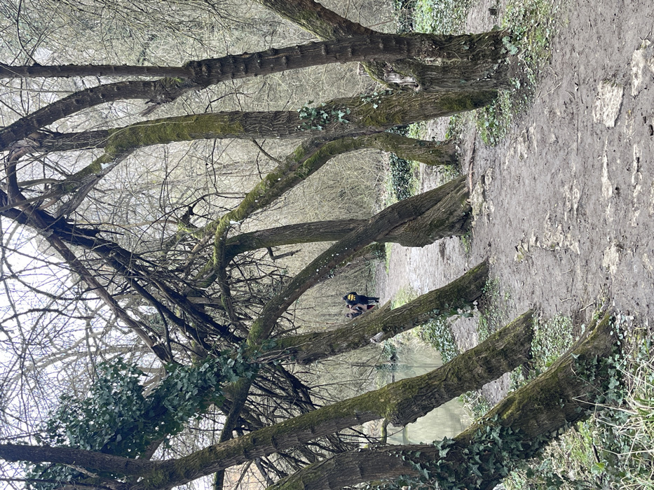 The image displays a wooded area in Petrevene, Bulgaria, under an overcast sky. A muddy dirt path, interspersed with lighter-colored stones, extends from the foreground into the mid-ground, curving slightly to the left. Numerous deciduous trees with bare branches line both sides of the path; their trunks are heavily covered in green moss and ivy. Several trees lean inward, their upper branches intertwining above the path. To the immediate left of the path, a calm body of water is visible, reflecting the dull sky. In the mid-ground, three individuals are observed walking away from the camera along the path, heading deeper into the wooded environment. They are dressed in dark, warm clothing, with one individual on the right exhibiting a yellow design on their back. The ground is sparsely covered with green vegetation, including ivy.