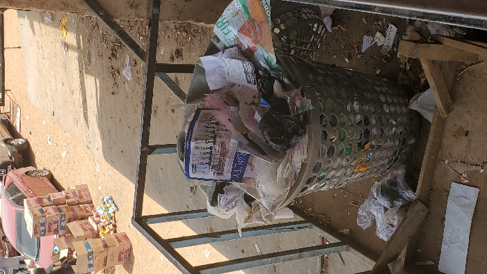 The image captures an outdoor scene in Jos, Nigeria, characterized by commercial activity and litter. In the foreground, a grey, perforated plastic basket is overflowing with various items of trash, including crumpled papers, plastic bags, and a discarded flyer displaying "UALITY." The immediate ground around the basket is covered with debris, small wooden planks, and additional plastic waste. Further into the midground, a reddish-brown dirt expanse, partially transitioning to a light grey concrete patch on the right, serves as a staging area. A red sedan is parked on the dirt, its rear facing the viewer. Adjacent to the sedan, numerous cardboard boxes, many labeled "BUNCH," are stacked in various configurations, with additional colorful packages scattered on the ground nearby. A dark-skinned individual, wearing a dark shirt, is partially visible on the left side of the red car, appearing to interact with the stacked boxes. Behind the red sedan, the front section of a light-colored SUV or truck is visible. The scene is illuminated by bright daylight, casting clear shadows.