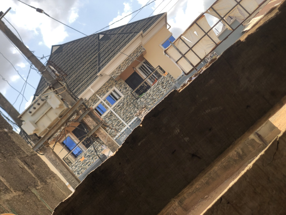 The image captures an upward, diagonally tilted view of a multi-story building and a utility pole under a partly cloudy sky in Egan, Nigeria