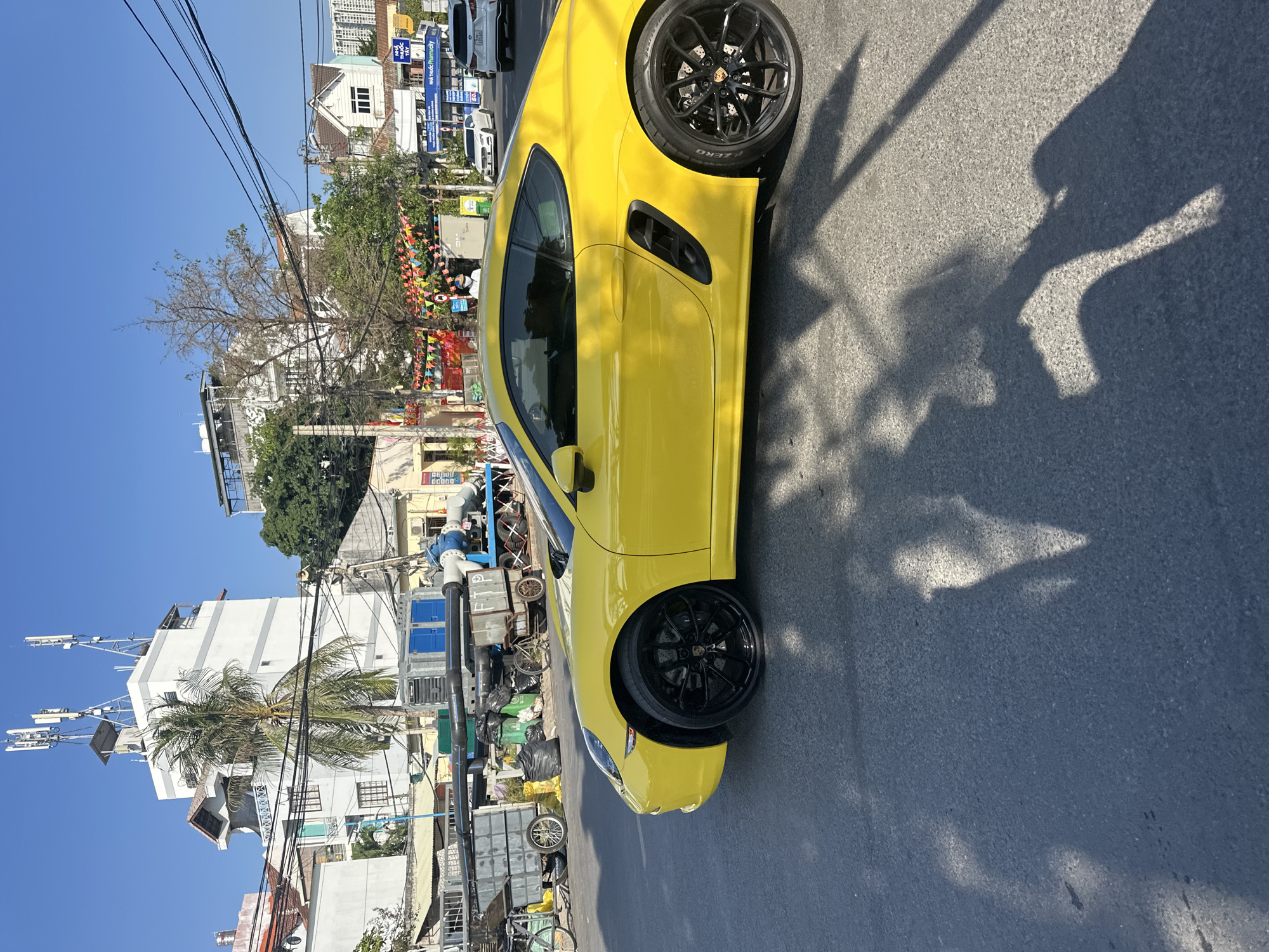 An outdoor daytime scene in Thủ Đức, Vietnam, captures a bright yellow Porsche Cayman sports car in profile, facing left, on an asphalt road. The car features black multi-spoke wheels and black side air intakes. Strong sunlight from the upper right casts distinct, elongated shadows from the car and unseen objects onto the road surface. To the immediate left of the car, along the roadside, a collection of utility equipment is visible, including large blue industrial units with associated pipes, black refuse bags, and two-wheeled pushcarts, some near bicycles. In the background, a dense urban environment features multiple multi-story buildings, predominantly white or light-colored, with a mix of flat and tiled roofs. A prominent white building on the left has several cellular antennas mounted on its rooftop. Numerous overhead power lines and communication cables traverse the scene. Vegetation includes a tall palm tree and other deciduous trees interspersed among the structures. Further down the street on the right, additional vehicles are visible, including a white Lexus SUV (license plate 51H 639.42) and a white sedan. A "NHÀ THUỐC Pharmacycity" sign is clearly visible on a building facade. Multi-colored decorative flags are strung across the street. A person wearing a white face mask and a light-colored shirt is partially visible on the left side of the street, near the flags. The sky is clear and bright blue.