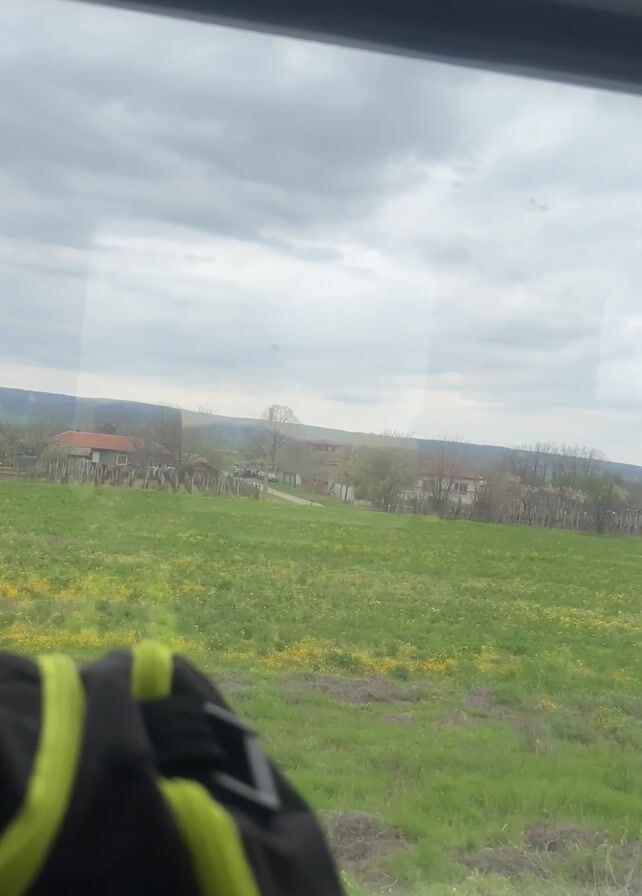 A view of a landscape from inside a moving vehicle, likely a train or bus, is captured. The window frame is visible at the top and sides, with a partial view of a black backpack with neon green accents in the lower left corner. Outside, a field of green grass with many yellow wildflowers extends into the distance. The field leads up to a row of small houses or buildings, surrounded by trees with bare branches, suggesting it may be early spring. In the background, a faint outline of hills can be seen under a cloudy, overcast sky. The scene evokes a sense of travel through a rural or countryside area.