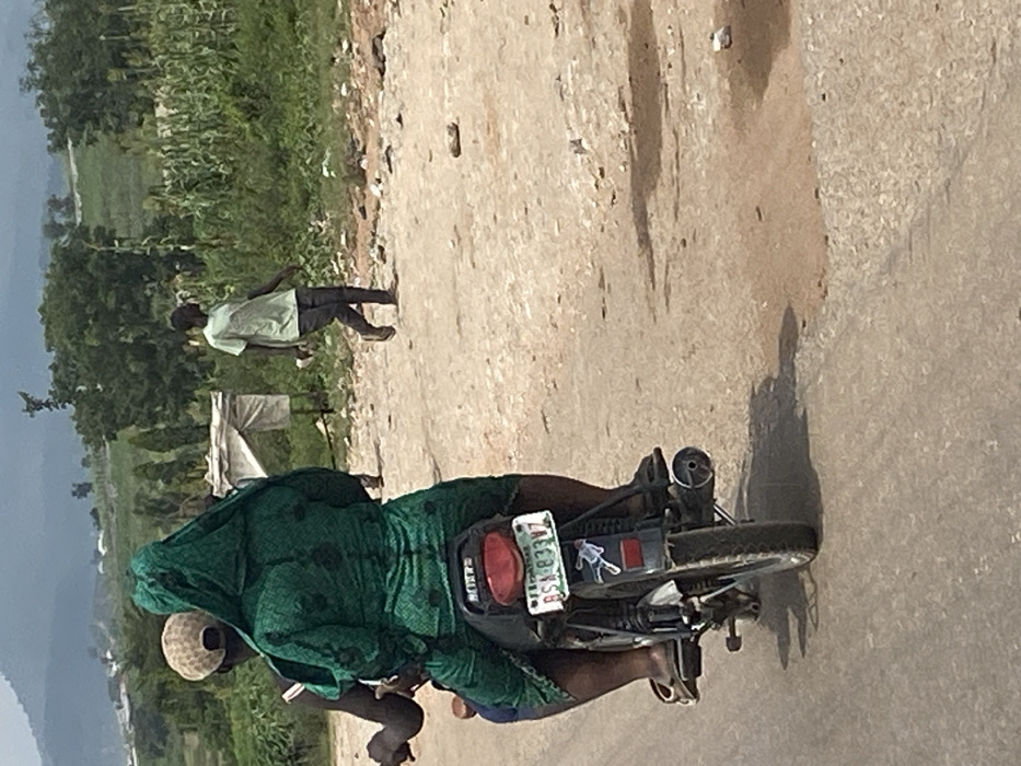 This image depicts an outdoor daytime scene on a road in Lokoja, Kogi State, Nigeria. In the foreground, a dark-colored motorcycle is traveling on a paved asphalt surface. Two individuals are riding the motorcycle. The driver, seated in front, wears a light-colored, possibly khaki-colored, cap and a dark top; only the back of their head and right shoulder are clearly visible. The passenger, seated behind the driver, is wearing vibrant green patterned traditional fabric draped over their head and body. Both individuals on the motorcycle are wearing open-toed sandals. The motorcycle's rear is visible, featuring a red taillight and a Nigerian license plate displaying "KOGI | RSA-833VZ." A white sticker of a stylized figure is affixed below the license plate. The motorcycle casts a shadow to its right. To the right of the motorcycle, a dirt and gravel shoulder runs parallel to the paved road. A person with dark skin is walking on this dirt path, moving from right to left. They are wearing a light green short-sleeved t-shirt and dark trousers, along with light-colored sandals or flip-flops. In the mid-ground, further to the right, a makeshift structure constructed from light-colored fabric (possibly tarpaulin) over a frame is partially visible. The background features dense green vegetation, including trees and what appear to be tall crops, suggesting an agricultural or semi-rural environment. Distant hills or mountains are visible under a hazy sky. The overall scene is illuminated by strong sunlight, creating distinct shadows.