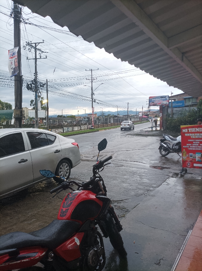 A street scene under a corrugated metal awning on a rainy day. A silver car is parked beside a red and black motorcycle in the foreground. Across the street, a white car drives past two pedestrians standing near a storefront with an "AC Center" sign. A poster advertising a political candidate is affixed to a utility pole. A smaller motorcycle is parked near a sign reading "MI TIENDA, VENTAS AL POR MAYOR Y AL DETAL". Mountains are visible in the distance under an overcast sky.