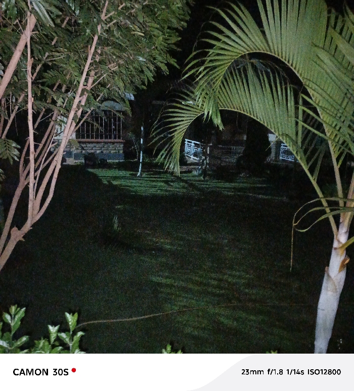A night scene shows a yard with a building partially visible in the background. A palm tree stands on the right side of the frame, while a different tree with thin branches is on the left. The grass is dark green, and the light source is unseen. The building features dark windows with bars. A white railing is also visible in the background near the building. The camera settings are displayed at the bottom.