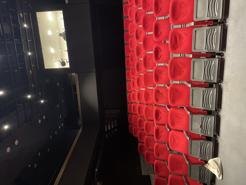 The image displays the interior of an auditorium located in Blagoevgrad, Bulgaria. Multiple rows of unoccupied red upholstered seats, each with grey armrests and seat bases, are arranged in a tiered layout on a dark floor. A light-colored bag rests on the floor adjacent to the leftmost seat in the front visible row. The auditorium features dark walls, a dark ceiling with recessed lights, and a dark balcony structure. Positioned on the upper left, within the balcony, is a brightly lit, glass-enclosed control booth. Inside this booth, a single individual wearing a dark cap is partially visible, seated at a console. An additional piece of equipment, possibly a spotlight, is also present within the booth. The main seating area of the auditorium is dimly lit.