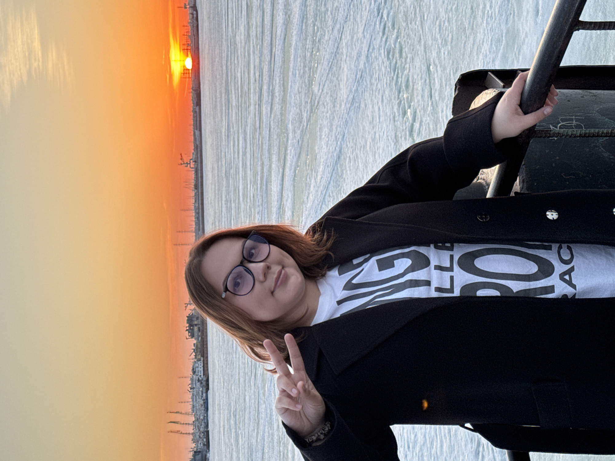 A woman stands on what appears to be a pier or elevated structure. She wears a black coat over a white t-shirt, and round glasses. She holds onto a dark metal railing with her right hand, and her left hand is raised in a peace sign. In the background is a frozen body of water or a large icy plain. The sun is setting on the left side of the frame, casting an orange glow. In the distance are buildings, likely part of the city, and structures that resemble cranes or industrial equipment. This is likely the city of Chaikovsky, Russia, based on the prompt.