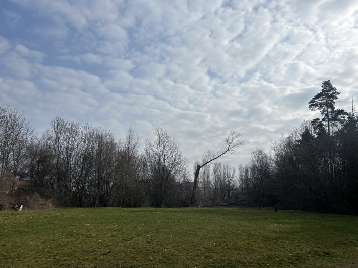 The image displays a park or green area in Sofia, Bulgaria, under a sky largely covered by altocumulus clouds. The foreground is an expanse of green grass, exhibiting some brown patches. A dense line of leafless deciduous trees forms the midground and background, indicating a winter or early spring season. On the left side, a small white animal is visible near a pile of brown branches. A prominent, broken tree trunk stands centrally, with one significant branch extending diagonally upwards and to the left. The treeline on the right features denser foliage, including a tall coniferous tree. Faint architectural structures are discernible through the trees in the distant background. No human figures are present.