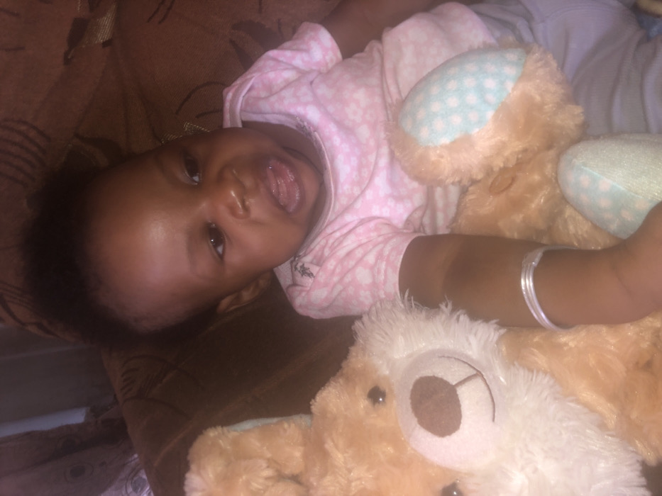 An infant of apparent African descent is depicted seated indoors in Rido, Nigeria. The infant, wearing a pink short-sleeved top with a white floral or patterned design and light-colored bottoms, occupies the right side of the frame. A two-band silver-colored bracelet is present on the infant's left forearm. The infant's dark hair is styled upwards. The mouth is open, revealing the tongue, and the eyes are directed towards the right. To the infant's left is a large, light brown stuffed animal, possibly a bear or bunny, with white fur detailing around its snout, black eyes, and a dark brown nose. Its paw pads are constructed from light blue fabric with white polka dots. Both subjects are positioned against a blurred background of dark brown, textured upholstery, consistent with an armchair or sofa. The infant's left arm is positioned near the stuffed animal's body.