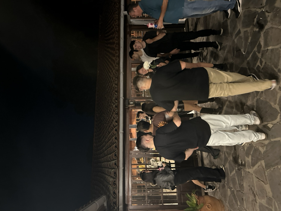 The scene depicts an outdoor patio at night at Arafe Resto Bar in San Fernando del Valle de Catamarca, Argentina. Approximately twelve individuals, primarily young adults, are standing in various small groups on irregular stone paving. In the background, a building features a reddish-brown tiled roof and wooden-framed windows, through which a lighted interior and the word "ARAFE" are visible. To the far left, a large terracotta planter holds a green plant. People are dressed in casual attire. A male in a black t-shirt and light-colored pants stands with his back to the camera in the left foreground. To his right, another male in a brown t-shirt with a sun emblem is partially visible. Further back, a female in a dark jacket and pants holds a dark object. In the central-right, a male in a black t-shirt and tan pants also stands with his back to the camera. Adjacent to him, a female wearing a dark top smiles while holding a bouquet of white flowers. A male in a black t-shirt and dark pants stands facing the camera, holding a dark cup in his right hand. To the far right, a male in a blue collared shirt and blue jeans holds a red cup, possibly containing a Red Bull can, and smiles towards the group. Individuals are engaged in conversation, with some holding beverages. The overall interaction suggests a social gathering.
