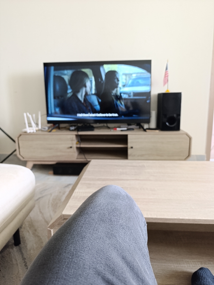 The image presents an indoor scene, viewed from a first-person, seated perspective, located in a residential setting within Nairobi, Kenya. In the immediate foreground, the bent knees and upper thighs of an individual wearing gray denim jeans are prominent, extending from the lower left to the lower right of the frame. To the left, a segment of a light-colored, upholstered furniture piece, possibly a sofa armrest, is visible. A light-toned wooden coffee table occupies the lower mid-ground, positioned in front of the viewer. The mid-ground is dominated by a flat-screen television displaying a scene with two individuals inside a vehicle. Subtitles are partially visible at the bottom of the screen, reading, "I told them what I believe to be true." The television rests on a light-colored wooden TV stand featuring central open shelving and side compartments. To the left of the television, a white Wi-Fi router with three visible antennas is present. To the right of the television, a black rectangular speaker unit is positioned, topped with a small American flag mounted on a yellow base. The background consists of a plain, light-colored wall. The floor beneath the furniture is light-toned and exhibits a subtle, swirling pattern, indicating a tiled or laminated surface. No direct interaction or activity by the observer is depicted, other than the implied act of viewing the television.