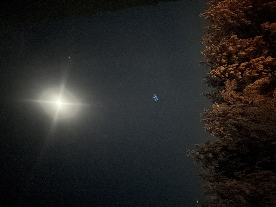 A night scene features a bright celestial object, likely the moon or a very bright star, radiating intense light and flare. A smaller, faint star is visible nearby. An object with faint blue illumination, possibly a drone or a light installation, is situated further away. To the right, the textured foliage of a tree or bush is illuminated in a warm brown or orange hue, likely by an artificial light source. The sky is a dark, muted color.