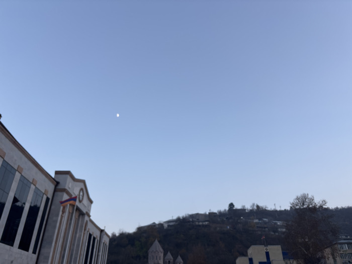 The image displays an urban landscape in Kapan, Armenia, specifically depicting the central square area. The upper two-thirds of the frame consists of a clear, light blue sky, with a prominent white disc, identified as the moon, situated in the upper-left quadrant. On the left side, the Kapan Municipality building is visible, characterized by a light-toned facade, multiple vertical dark-tinted windows, classical architectural columns, a partially visible clock face, and a flagpole from which an Armenian flag (red, blue, orange horizontal stripes) is displayed. Centrally in the midground, the distinctive dome and spire of Surp Mesrop Mashtots Church are observable. The background is dominated by a large, tree-covered hill, upon which scattered residential structures are visible. In the lower right of the frame, a large, bare deciduous tree partially obscures a building featuring a blue and white exterior. No individuals are present. The scene is illuminated by clear daylight, and the defoliated deciduous trees suggest an autumn or winter season.