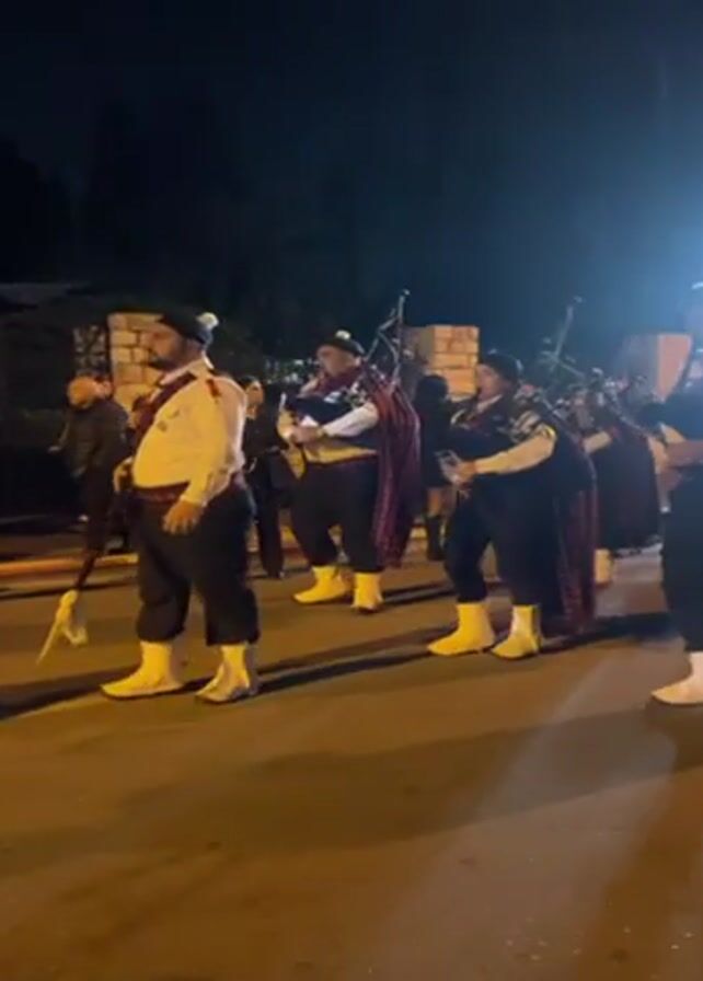 bagpipe band marching and playing on a dark street, likely at night. The band members are wearing traditional Scottish outfits, including kilts or tartan trousers, white shirts, hats and capes. Some members are playing bagpipes and marching in unison, while another carries a staff. The setting appears to be an urban environment, as indicated by the buildings and street lighting. There are a number of spectators on the left.