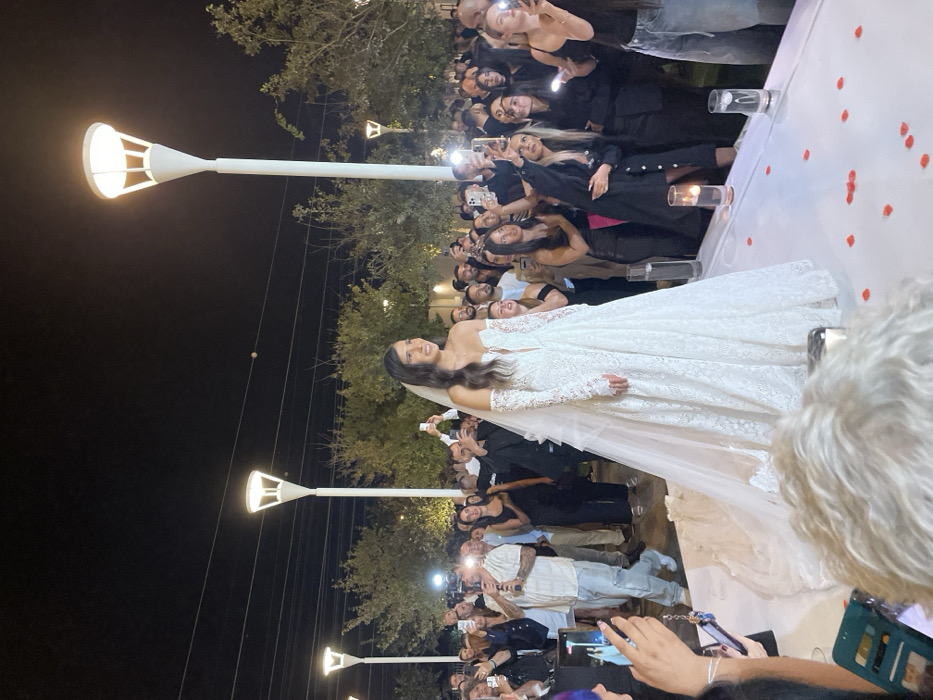 A nighttime outdoor scene in Shoham, Israel, depicts a young woman in a white, off-shoulder lace wedding gown with long lace sleeves and a veil. She has long, dark hair, is smiling faintly, and looks towards the viewer's left. She stands on a white elevated surface, which is adorned with scattered red petals, two clear glass candle holders containing lit candles, and a small glass of water. A crowd of numerous individuals surrounds this central figure, observing the event. Many members of the crowd are holding smartphones, several with active flashes, angled to record or photograph the woman. In the bottom-left foreground, the top of a person's head with grey hair is partially visible, also holding a smartphone pointed towards the subject. The background consists of a dark night sky. Several tall, white streetlights with modern, illuminated tops provide additional lighting. Dark-leaved trees and bushes are visible behind the crowd and between the streetlights. The environment indicates a celebratory gathering.