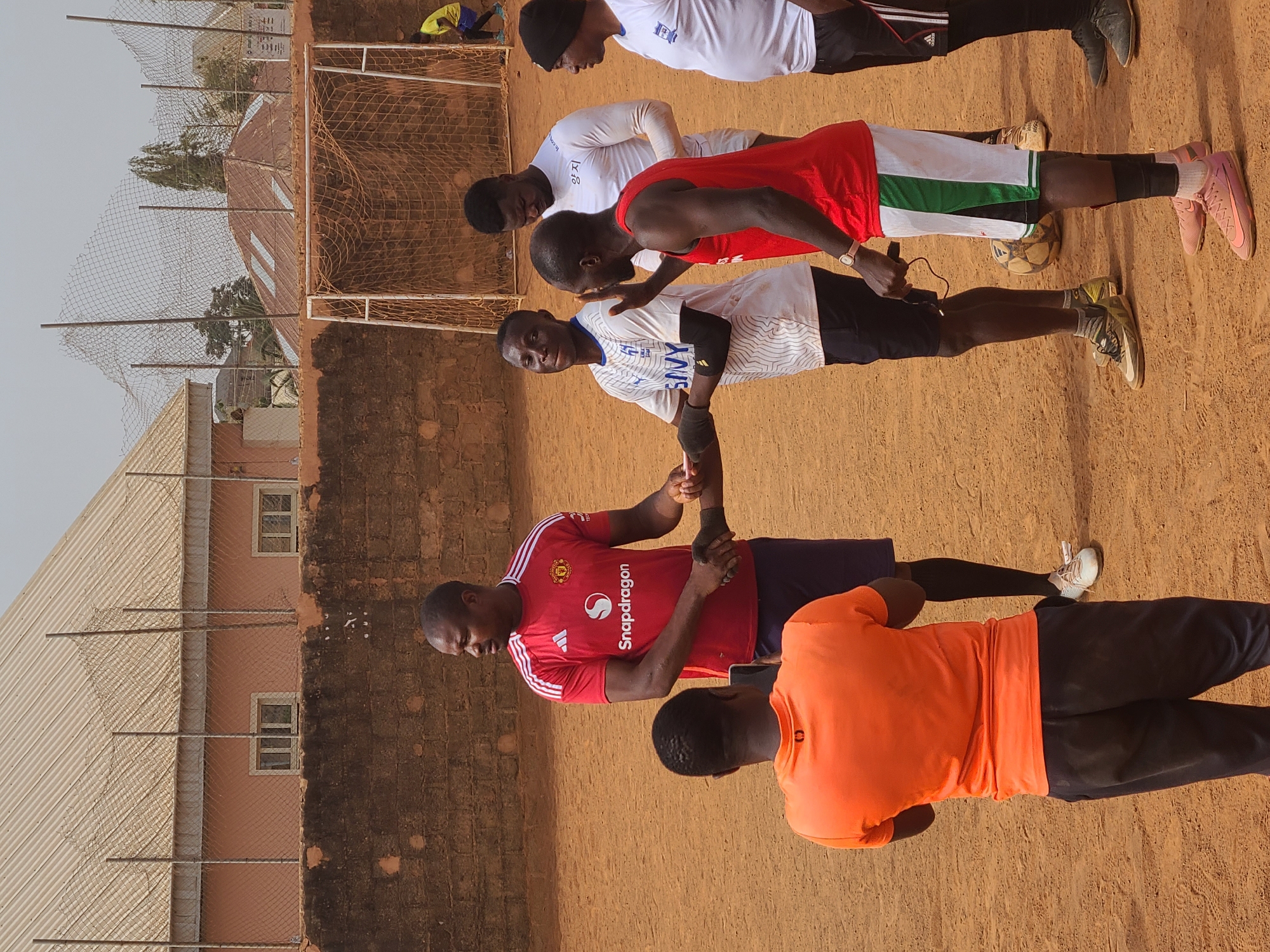 An outdoor scene in Barakin Lerawi, Nigeria, depicts a group of six adult males on a reddish-brown dirt playing field, likely a soccer pitch. In the foreground, a male with dark skin is seen from the back, wearing an orange short-sleeved shirt and dark pants, holding a black smartphone horizontally, seemingly recording the central interaction. In the mid-ground, slightly left of center, a male with dark skin wearing a red Manchester United jersey with a "Snapdragon" logo and dark shorts is shaking hands with another male with dark skin, who is wearing a white jersey with blue stripes and black armbands. To the right of this handshake, a third male with dark skin, wearing a red tank top and white and green striped shorts, gestures with his right hand while holding a small black electronic device in his left. A partial view of a soccer ball is visible on the ground near his feet. Two other males with dark skin stand further right: one in a white long-sleeved shirt with Korean text, and another in a white t-shirt, black shorts, and a black beanie. The background features a low, brown brick wall topped by a tall metal chain-link fence with netting. Behind this, several buildings with corrugated metal roofs are visible under a hazy sky; one prominent building has a peach-colored facade and two visible windows. A white and yellow-netted soccer goal stands on the right side of the background. A lone individual in a yellow shirt and blue shorts is visible near the goal, facing away.