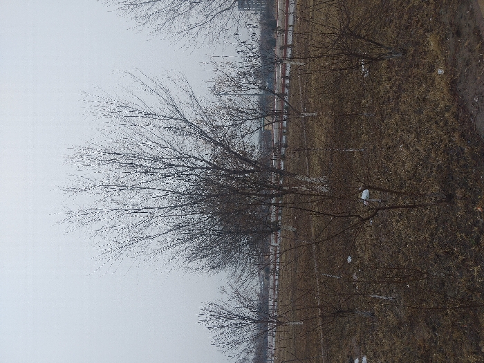 Bare trees stand against an overcast sky. The ground is covered in dry, brown vegetation, suggesting winter or early spring. Some patches of white, possibly snow or debris, dot the landscape. A fence runs along the horizon, partially obscured by the trees. A tall building is also visible.