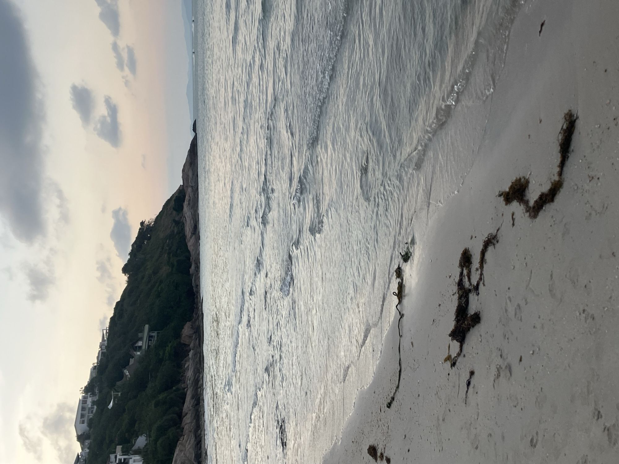 The image depicts a beach scene in Choeng Mon, Thailand. The shoreline is visible, with waves gently lapping onto the sandy beach. A rocky, tree-covered hill rises from the left edge of the frame. Several houses or buildings are visible on the hillside. Some seaweed is present on the sand. The sky is overcast with clouds, suggesting either an early morning or late afternoon scene.
