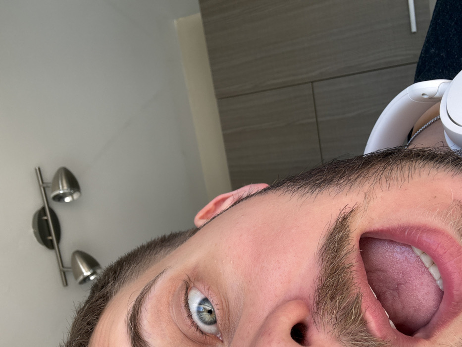 A close-up image depicts a partial view of an individual's face, located indoors in Sofia, Bulgaria. The subject's right eye is wide open, displaying a blue iris with a direct gaze towards the viewer. The mouth is open, exposing the tongue. A short, dark beard and mustache are present on the visible facial area. White over-ear headphones are worn around the subject's neck. The background consists of a plain white ceiling featuring a two-spotlight brushed metal track light fixture. To the right, light grey or brown vertical wood-grain panels, consistent with cabinetry, rise to meet the ceiling. The environment appears brightly illuminated.