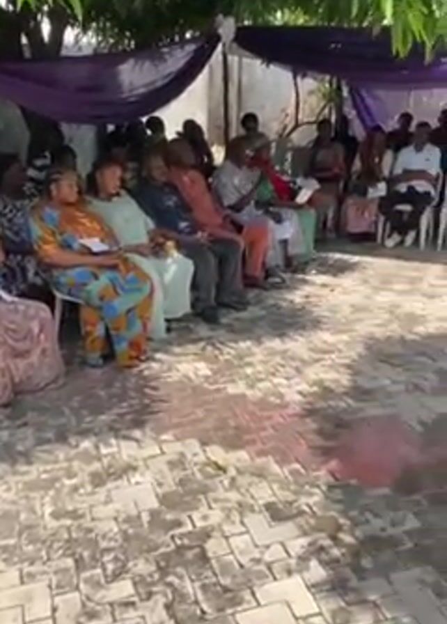 A man in a beige suit is standing and speaking in front of a seated audience under a purple-draped canopy. The audience is a mix of men and women, some holding papers. In the background, there's a white-clothed table. A woman walks by, partially obstructing the view. The ground is paved with a patterned brick. Trees are overhead, casting shade on the scene.