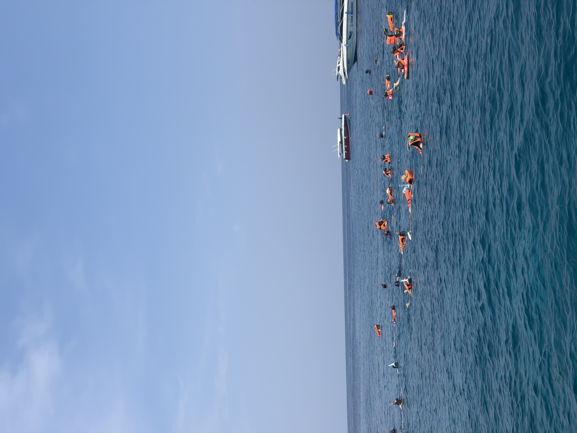 - "An outdoor aquatic scene depicts approximately 20 to 30 individuals engaged in snorkeling activities in deep blue, moderately choppy water under a clear, light blue sky" by FM-kRQMq1, licensed under CC BY 4.0