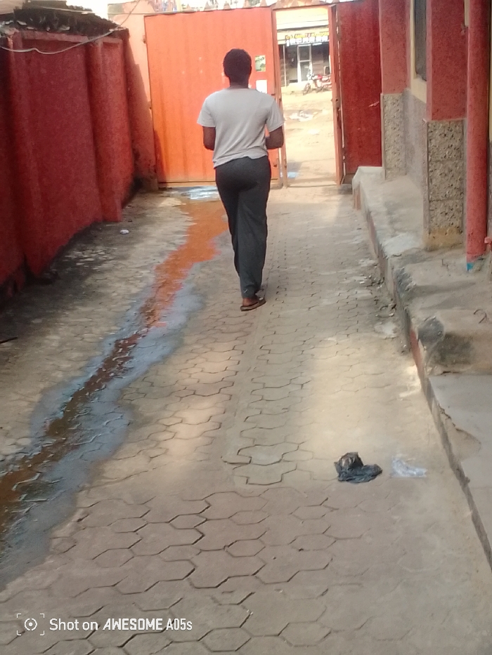 The image displays an outdoor paved pathway within the city of Egbagu, Nigeria. One adult individual is positioned centrally, viewed from the rear, walking away from the camera towards an open reddish-orange metal gate. The person wears a light-colored, short-sleeved t-shirt, dark trousers, and open-toed footwear. The pathway is composed of hexagonal interlocking concrete pavers. Along the left side, a reddish-orange corrugated metal wall or fence is visible. On the right, a building facade features a raised concrete curb or platform and a textured, light-colored lower section, with two reddish-orange vertical pipes or pillars. A prominent, elongated dark liquid stain, reflecting light, is visible on the paved surface, running down the center-left. In the lower right foreground, two pieces of debris are present: a crumpled dark object and a smaller, light-colored piece. Beyond the open gate in the background, a street scene is discernible, featuring commercial structures, a light-colored ground surface, and what appears to be a motorcycle parked on the street. The scene is illuminated by bright, natural daylight. The image includes a "Shot on AWESOME A05s" watermark in the lower left.