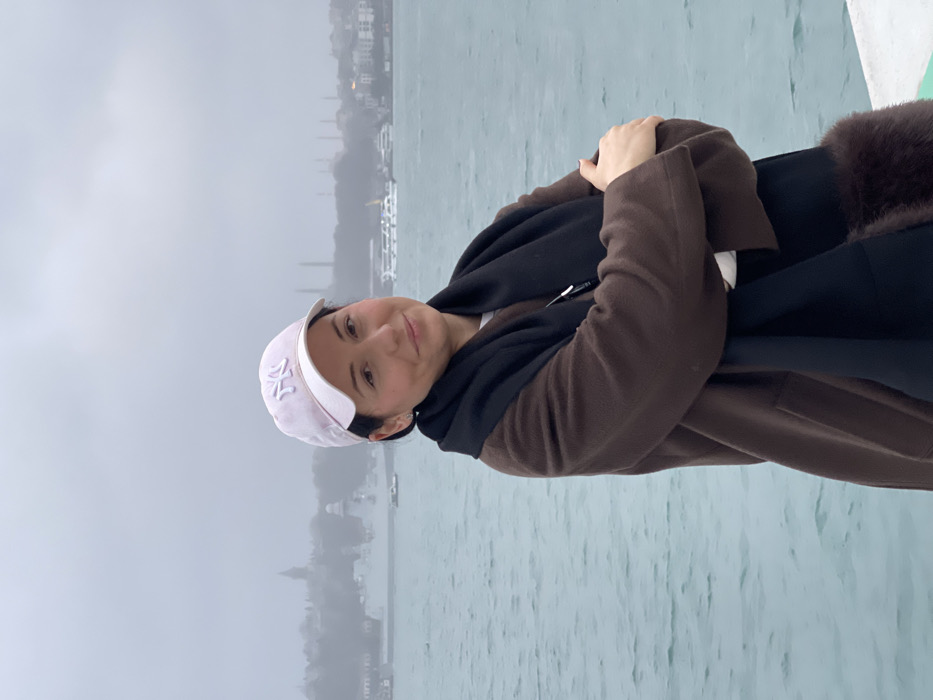 A female individual is depicted in a chest-up portrait, standing outdoors with a body of water behind her. She wears a light pink baseball cap with a white "NY" logo, a dark brown long coat, and a black scarf with a dark brown fur trim visible on its lower right end. Her arms are crossed over her chest, and she displays a slight smile while looking directly at the camera. The foreground includes a white concrete or stone structure, likely an embankment, partially visible at the bottom right. The midground features the Bosphorus Strait, characterized by choppy, turquoise-grey water. A grey naval vessel, possibly a frigate, is present on the water to the left of the subject. Multiple smaller passenger vessels or ferries are visible further to the right on the water. The distant background, heavily obscured by atmospheric haze, reveals the outlines of the historical peninsula of Istanbul (Fatih district). Visible structures include indistinct buildings consistent with the Topkapi Palace area on a hill, and multiple prominent minarets resembling those of the Hagia Sophia and/or the Blue Mosque, rising from the skyline to the right. The scene indicates the subject is positioned on the Beyoğlu side of the Bosphorus, specifically looking southeast across the strait towards the Fatih district.