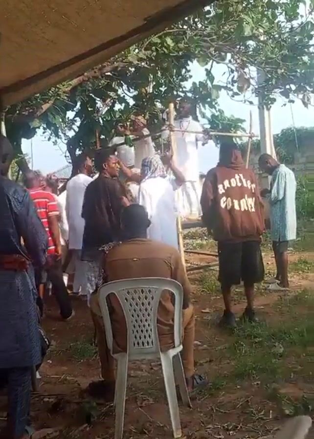 Several people are gathered outdoors under a makeshift canopy, including a man standing on a ladder and another sitting in a white plastic chair