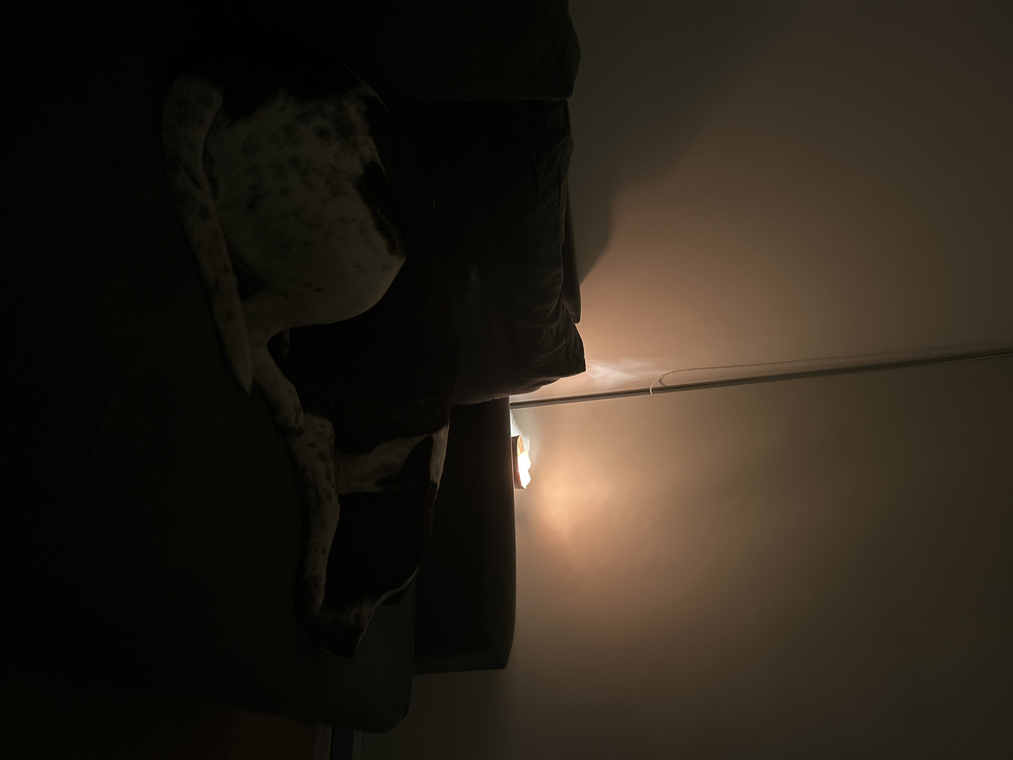 In an interior setting located in Villa San Andrés, Argentina, a medium-sized dog with a white coat patterned with dark patches is observed resting or sleeping on a dark-colored sofa. The dog is positioned with its body curled, its head facing towards the right side of the frame. The scene is dimly lit by a warm, orange-toned light source emanating from a small, dark bowl containing lighter objects (possibly candles or decorative stones) situated on a surface directly behind the sofa's backrest. This light projects upwards onto a plain wall, creating a soft glow and casting a shadow from the sofa. A metallic-link chain, likely part of a window covering mechanism, hangs vertically along the right edge of the frame. No human subjects are visible.