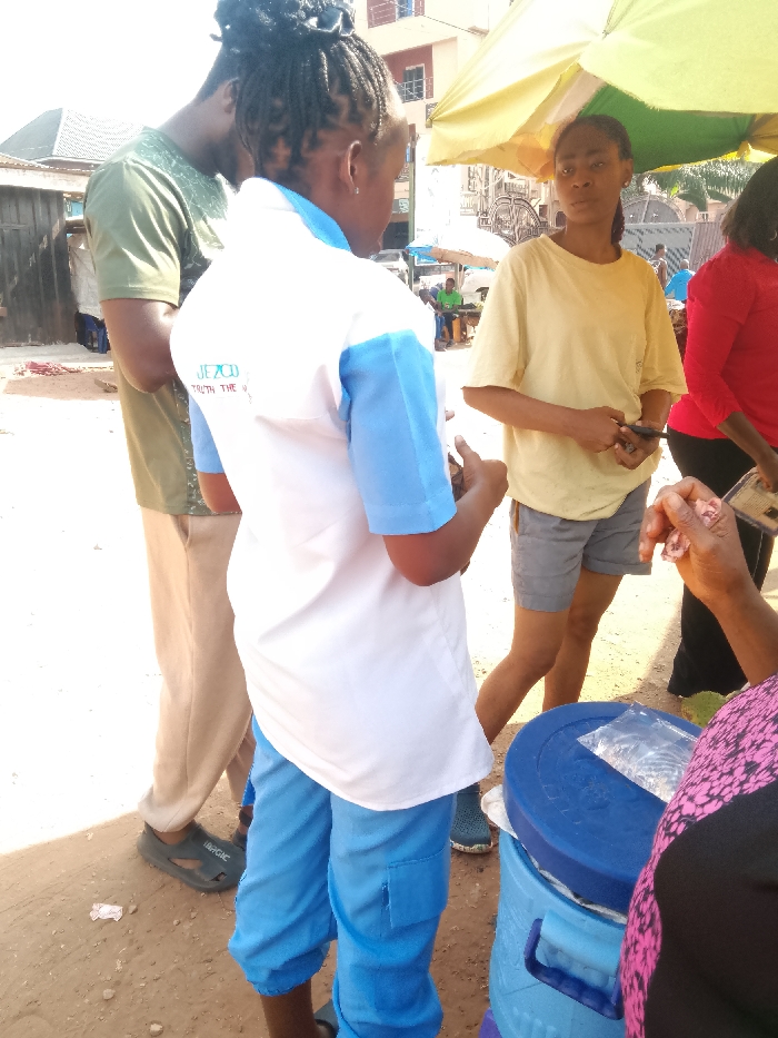 The scene depicts an outdoor gathering in Umuokpu, Nigeria, under bright daylight conditions. In the foreground, a female individual is observed from behind, wearing a white short-sleeved top with light blue sleeves and light blue cropped pants. A logo on her back reads "JEZCO TRUTH THE W". She has dark braided hair styled in an updo and appears to be holding a small object in her hands. To her right, a second female individual faces slightly left, wearing a loose-fitting pale yellow t-shirt and grey shorts. She holds a dark-colored smartphone horizontally in both hands at waist level, with a neutral expression. To the left of the central figure, a male individual is seen from behind, wearing an olive-green patterned t-shirt and light tan trousers, paired with dark sandals. He has dark, braided hair or dreadlocks tied up. In the bottom right foreground, a partial view of an individual wearing a black top with a pink geometric pattern is visible, holding several small, clear plastic packets in their hand. Directly in front of this individual is a blue insulated cooler with a matching blue lid, upon which additional clear plastic packets are placed. An overhead yellow and green striped market umbrella extends into the frame from the top right, providing shade. In the background, multiple other individuals are visible, including one in a bright green shirt further back. Structures in the midground and background include multi-story buildings and simpler, possibly commercial or residential, establishments. The ground is unpaved, consisting of dirt and small stones.