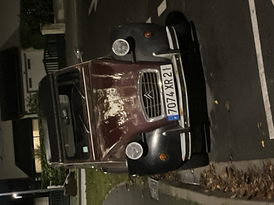 A somewhat weathered, burgundy Citroen 2CV is parked on the side of a street. The car's black fenders are visible, as is the front grille. The license plate reads "7074 XR 21". The paint on the hood is faded. The car is parked next to a curb with fallen leaves nearby. In the background, a house with a gated entrance and shrubbery are visible. The scene appears to be captured at night.