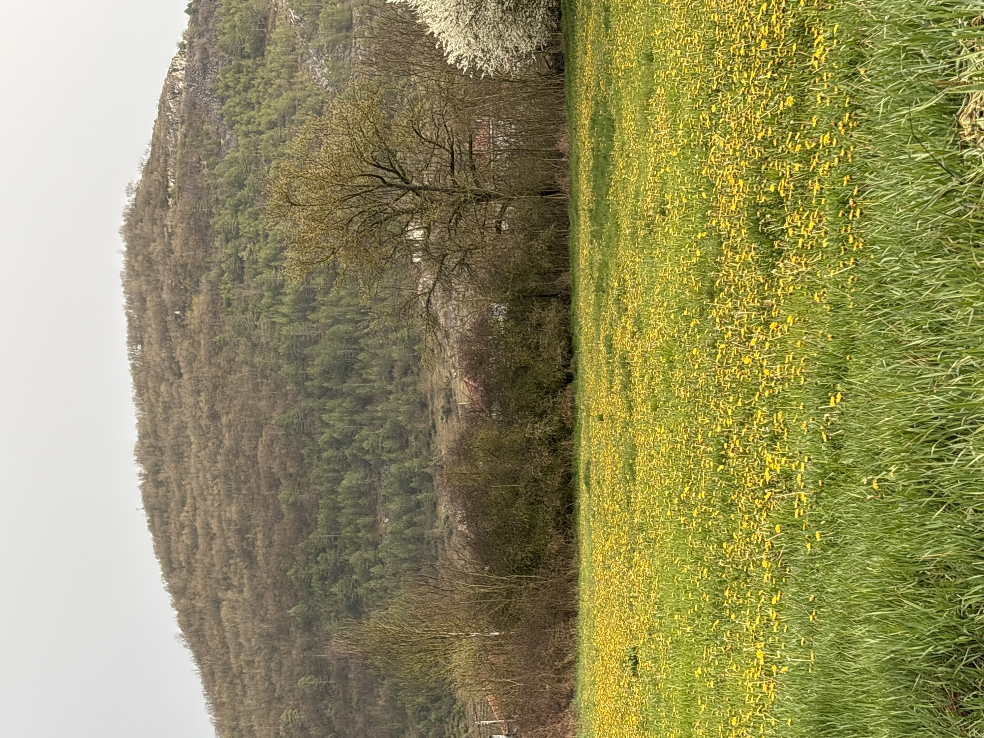 This image depicts a rural landscape near Ochyro, Greece, under an overcast sky. The foreground is dominated by a field of green grass heavily interspersed with numerous yellow dandelions. In the midground, a line of various deciduous trees and dense bushes forms a natural barrier. Notable trees include a tall, slender, light-barked tree on the left, a larger deciduous tree with developing light green foliage towards the right of center, and a tree with dense white blossoms on the far right. Behind these trees and bushes, portions of residential structures with reddish roofs are partially visible. On the far left midground, a power pole with horizontal crossbars and visible wires stands partially obscured by vegetation. The background features a large hill or mountain, with its lower slopes densely covered by evergreen trees and its upper slopes by deciduous trees in an early spring state, exhibiting bare or sparsely leafed brown branches. Rocky outcrops are visible on the higher parts of the hill. No people or animals are present.