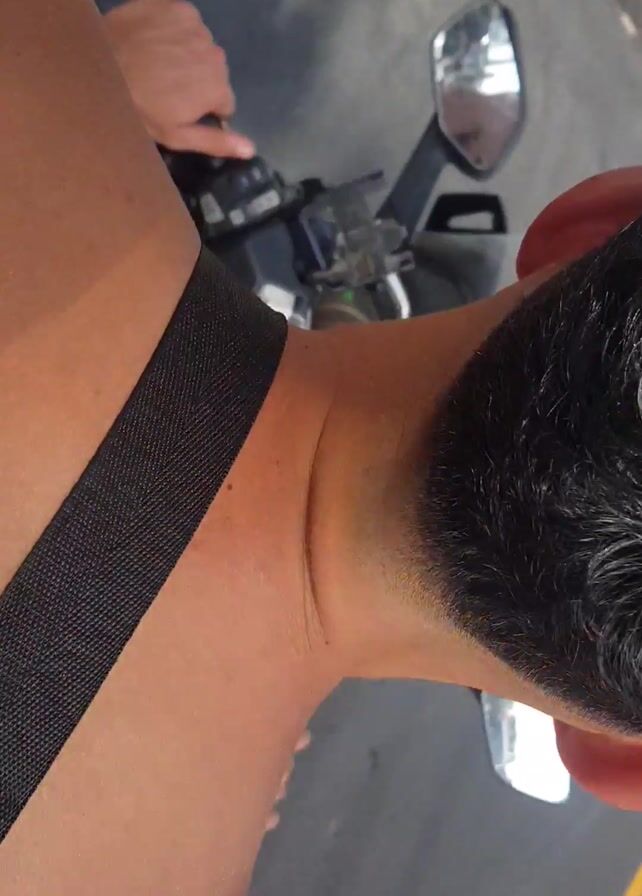 A man is riding a scooter down a street in a town or city. The camera is positioned behind him, focusing on the back of his head, neck, and shoulders. He has dark, short, wavy hair. He is wearing a black strap across his shoulder. The street has yellow lines dividing lanes, and there are white cars, other scooters, and pedestrians visible. Buildings and power lines are in the background.