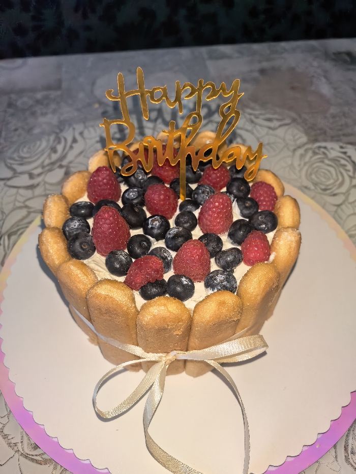 - "A charlotte-style birthday cake is centrally positioned on a white, scalloped-edge cake board with an iridescent trim" by FM-oT3Zp1, licensed under CC BY 4.0