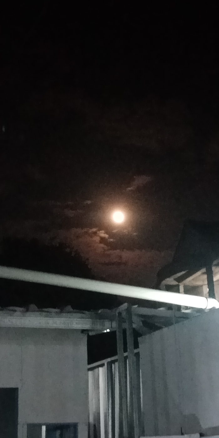 The image depicts a nighttime scene in Ciherang, Indonesia. A large, bright, full or near-full moon is prominently positioned in the upper-middle sky, partially obscured by dark, reddish-tinged clouds. The sky is predominantly black. In the lower half of the frame, architectural elements are visible. A thick, white, horizontal pipe or beam extends across the midground. Below this pipe, sections of light-colored building walls are present, including a wall on the left with a dark, rectangular opening (possibly a window or door). Corrugated roofing material is visible on the left. To the right, dark, angled rooflines and vertical structural supports, possibly metal scaffolding or building frames, are discernible. No individuals or specific actions are visible within the frame. The scene suggests an urban or semi-urban environment viewed from between or above buildings.