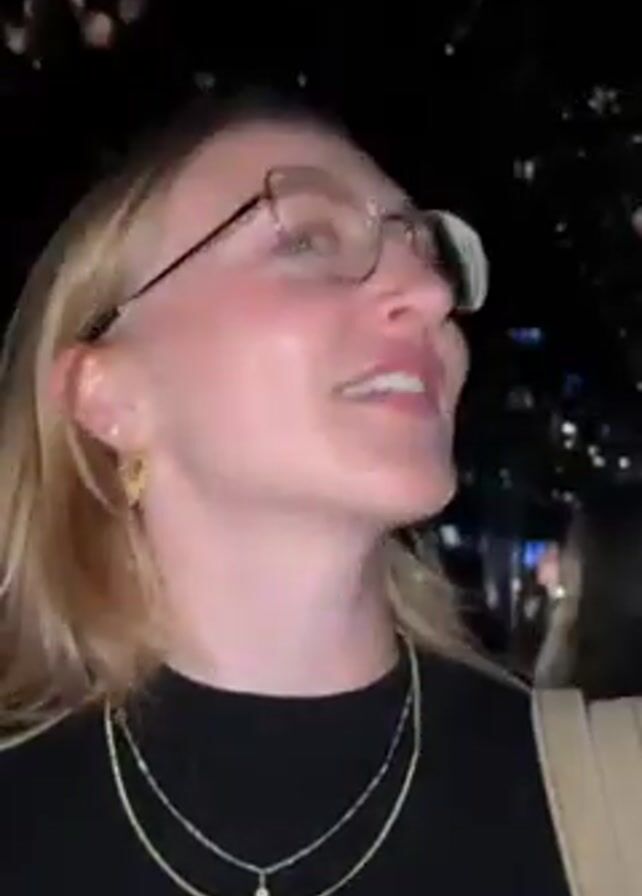 A woman with blonde hair and glasses stands inside a mirrored room. She is wearing a black top and two necklaces, and she has gold earrings. The room is dark, with bright linear lights reflected in the mirrors on the walls and ceiling, creating an illusion of endless space. The woman appears surprised and then smiles, looking around the room. Another woman can be seen in the background reflection. High pitched sounds or noises are present in the video.
