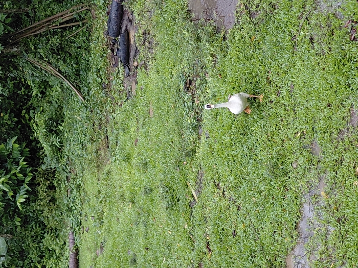 A single white goose walks across a lawn of vibrant green groundcover. The foliage extends to the left, transitioning to a dense wall of dark green leaves. A dark, wet area with charred wood is visible along the edge of the green space, adding contrast. The goose is positioned toward the right side of the frame, facing the viewer.