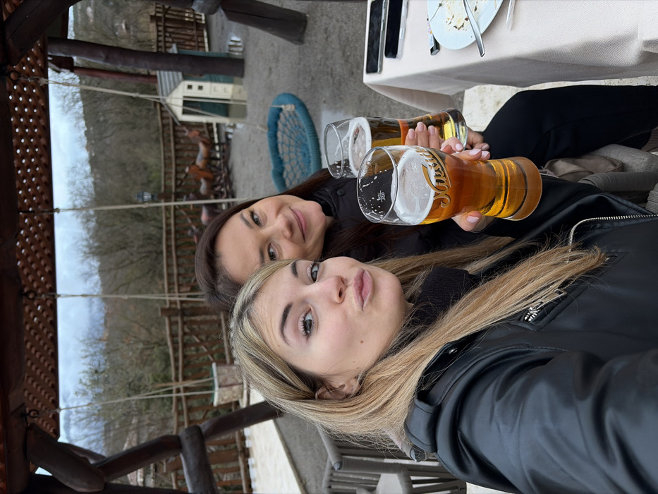 Two women pose for a selfie, each holding a glass of beer. One woman has blonde hair and wears a black jacket, while the other has dark hair and wears a black top. They are outdoors, possibly on a patio or deck, with wooden structures surrounding them. A table is visible with a phone and remnants of a meal. In the background, there are trees and a small building. The sky appears cloudy.
