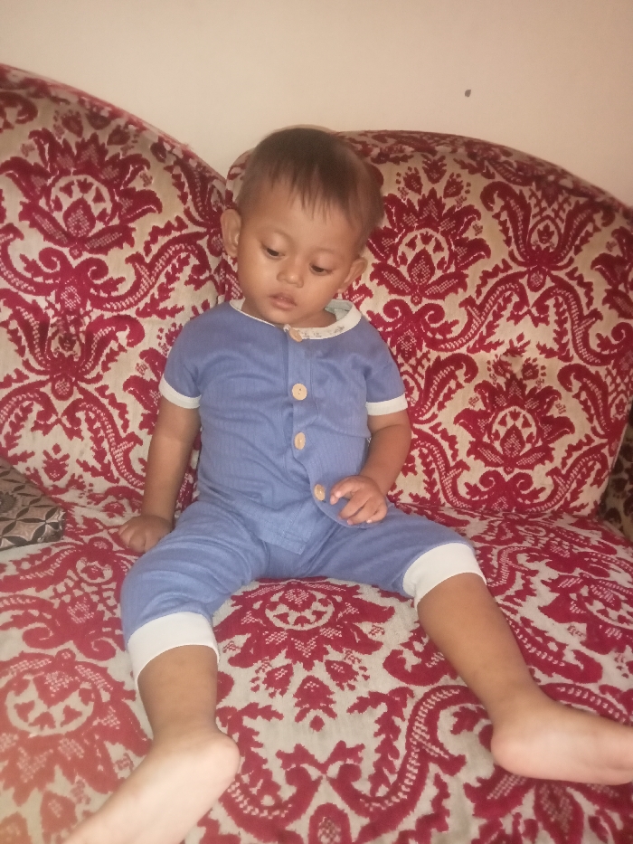 A single young child, appearing to be a toddler, is seated centrally on a sofa in an indoor setting in Unknown, Unknown