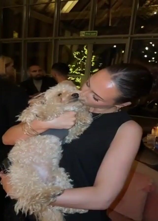 A young woman with her hair pulled back kisses a small beige dog that she is holding, which licks her in return. She smiles, gives a small wave, and then excitedly sticks her tongue out and shouts. The woman wears a black dress and gold jewelry. Other people are visible in the background, as well as a Christmas tree, plants, and candles. There is an exit sign visible above the door.
