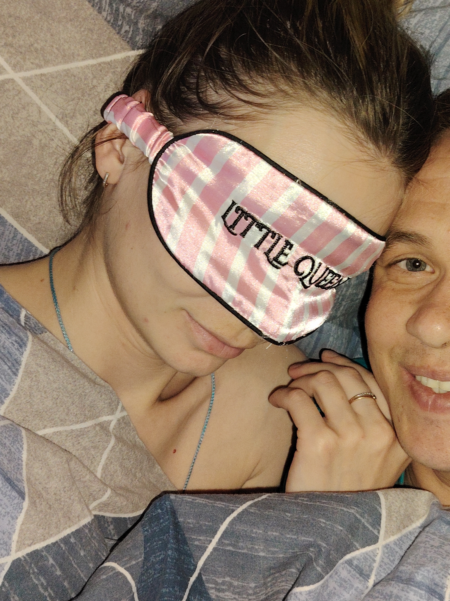 A close-up image features two individuals lying in bed. The person on the left is wearing a pink and white checkered sleep mask with the words "LITTLE QUEEN" embroidered on it. They appear to be resting or sleeping, with their eyes covered by the mask. A light blue necklace is visible around their neck. The person on the right is awake and smiling, with part of their face visible. They are wearing a ring on their finger, and their hand is touching the other person's shoulder. They are lying under a blue and gray patterned blanket. The image was most likely taken indoors, but location and date are not recognizable.