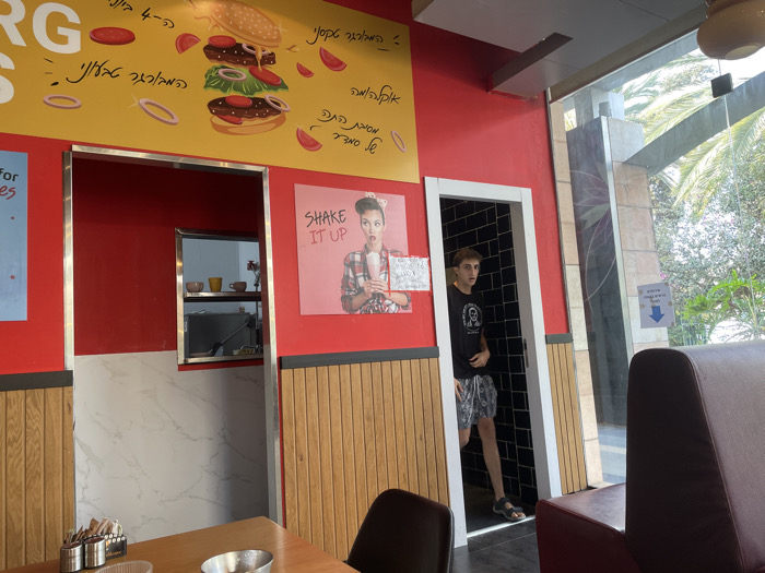 Inside a restaurant with a red and yellow color scheme, a young man stands framed in a doorway with black tiled walls. He wears a black t-shirt and patterned shorts, along with sandals. Adjacent to the doorway, the wall features a retro-style "Shake It Up" advertisement. The restaurant has decor elements like food-themed murals and wood paneling along the lower walls. In the foreground, a table setting and booth-style seating are visible, indicating a dining area. A window to the right reveals lush greenery.