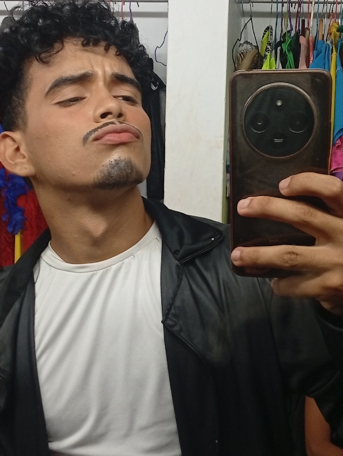 A selfie depicts a person with curly dark hair, drawn-on mustache, and a small goatee, looking to the side with a raised eyebrow. They wear a white t-shirt and a black leather jacket. The individual holds a smartphone with a circular camera array. In the background, a closet with colorful clothing is visible. The setting appears to be indoors.