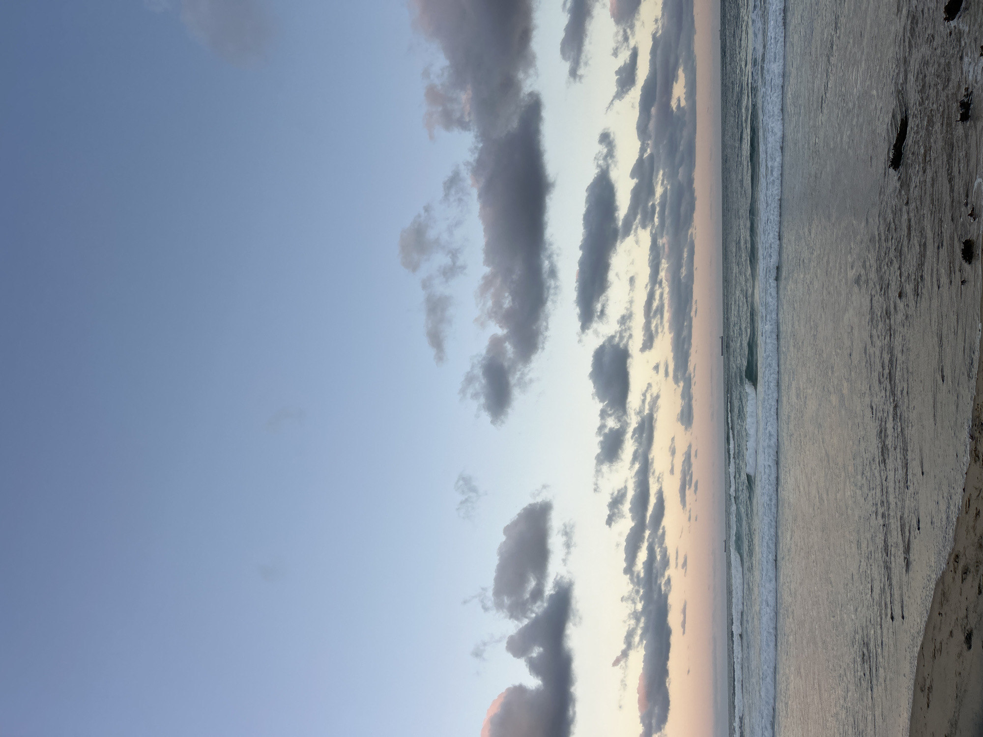 beach scene at Bulli, Australia. The sky is blue with scattered grey clouds, indicative of either sunrise or sunset. Waves are breaking on the shore, separating the wet sand from the sea. The sand is a light grey color and shows signs of being disturbed, with footprints visible in some areas. There are no people visible in the image.